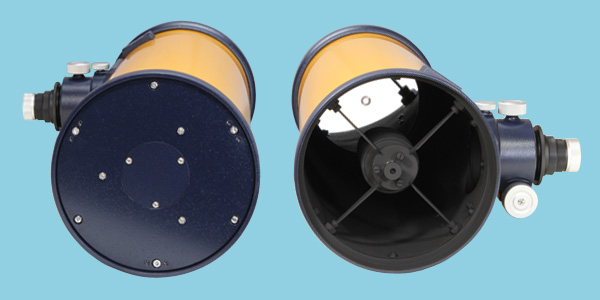 斜鏡は短径63mmのものを搭載しています。現行のイプシロンと同様の光量の偏りを抑えるための偏心斜鏡や、羽根式スパイダーを採用しています。主鏡の保持方法はε-180EDと同じ構造を採用しています。主鏡の光軸調整ネジは引きネジの両側に押しネジを配置した構造です。外気温に早く馴染ませるために中央の蓋を外せるようになっています。光軸調整ネジの頭部が下にはみ出さない構造なので安心して鏡筒を立てて置くことができます。