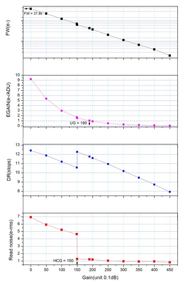 ●ASI662MCには「HCGモード」が組み込まれており、高いゲイン値での読み出しノイズを効果的に低減し、低いゲイン値と同じように広いダイナミックレンジを維持可能です。ゲイン値が150の場合、HCGモードは自動的にオンになります。