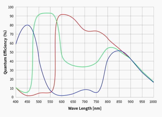 ●裏面照射型CMOS構造の利点は、読み出しノイズの低減と感度の向上です。ソニーは特にIMX662センサーにSTARVIS™ 2テクノロジーを採用し、低照度での優れた感度を実現しています。また、可視光および近赤外光領域で高い画質を実現しています。