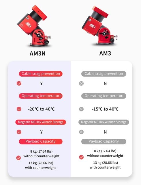 ●マイナーチェンジされたAM3Nは「ケーブルマネージメントシステム」を導入。赤緯体のアリミゾ後端に12V電源出力端子とUSB端子が追加されました。これにより、ASIAIRやCMOSカメラやオートフォーカサー、赤道儀へ接続するUSBケーブルや電源ケーブルなどの取り回しが格段に向上しました。これまでのように、鏡筒の位相(向き)によってケーブルが必要以上に引っ張られるような心配がなくなり、快適な撮影環境を提供します。