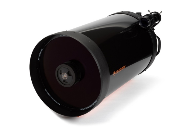 口径:355mm、焦点距離:3,910mmというスペックながら鏡筒全長は約790mmというコンパクト設計。とりまわしもしやすく、バランスもとりやすい鏡筒です。ピント合わせは主鏡セルを動かす方式で、接眼部脇にあるピント調節ノブを回転させることで行います。また光軸調整は副鏡の3本の調整ネジで行えます。補正板の素材にはWater White Glass(無色透明ガラス)を採用。さらにXLTスターブライトコーティングを施すことでシャープかつコントラストの高い星像を得ることができます。