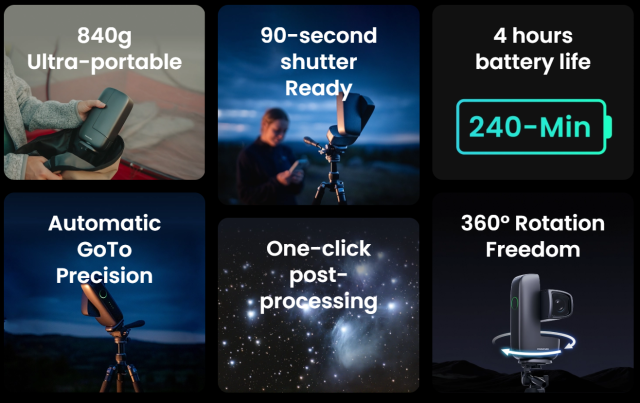 本体重量はわずか約 840g。一般的なスマート望遠鏡と比べても圧倒的に軽く、バッグやリュックのサイドポケットにも難なく収まるサイズです。三脚を含めたセット一式を持ち出しても、長時間の移動や徒歩での観測地アクセスで疲れを感じにくいのが大きな魅力です。