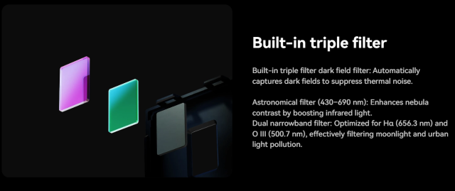 | 内蔵フィルター | 広帯域アストロ(430–690 nm)/デュアルナローバンド(Hα・OIII) |