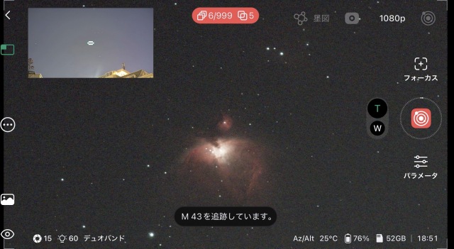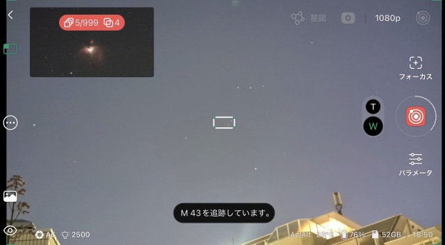 広角カメラと望遠カメラをワンタップで切り替えながら操作できます。広い夜空の中から目当ての天体を見つけ、そのまま望遠へズームインする流れは、まるでファインダーを覗きながら鏡筒を向けるような直感的な体験です。