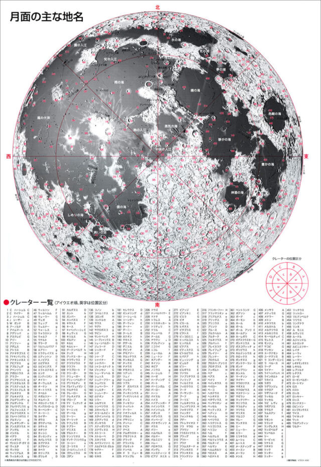 さらに、月面の主なクレーターなどをアイウエオ順に並べ、月面上での位置がわかるようにした地名図(A3判)も付いています。