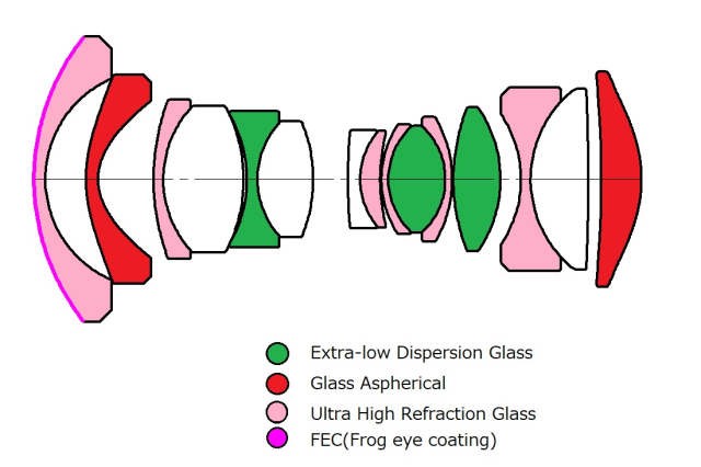 レンズ構成:9 群 15 枚 (非球面レンズ 2 枚、ED レンズ 3 枚を含む)