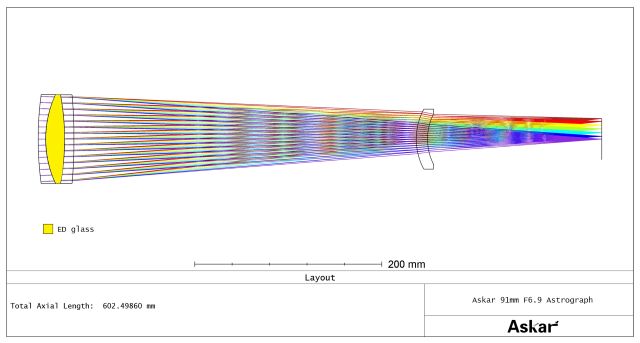 Askar 91F鏡筒は、口径91mm焦点距離609mm、口径比F6.7のED屈折望遠鏡です。