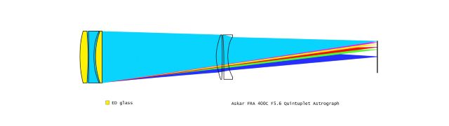 口径72mm、焦点距離400mm(口径比F5.6)という取り回しが良い鏡筒に、5群5枚のレンズを採用。2枚のEDレンズ(特殊低分散ガラス)をエアスペース配置した独自設計により、色収差・コマ収差・非点収差を高度に補正した、切れ味のある星像を実現します。