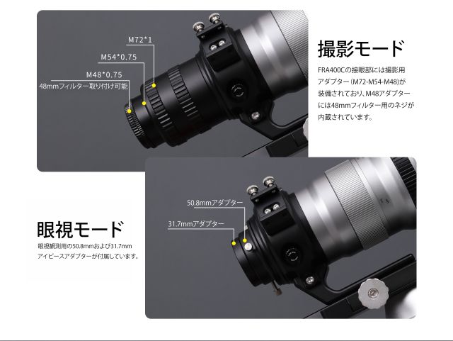 FRA400Cは、人気の「FRA400」の光学系を踏襲しつつ、カメラレンズのようなヘリコイドによるフォーカス操作と絞り羽根の操作が可能になった、初心者にも扱いやすい望遠鏡です。