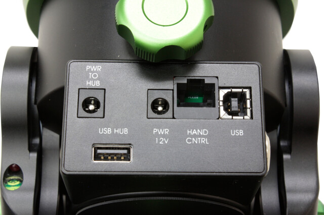 また赤経体後部にはPC接続用USBタイプAポート、ハンドコントローラーポート、USBタイプBポート、電源入力ポートを備えたハブが装備されています。このハブは回転しないため、ケーブルがからむ心配がありません。