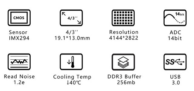 USB 3.0ポート: ASI294MC Proをフル解像度で16fps(14ビット、通常モード)で転送可能な5GBの帯域幅があります。