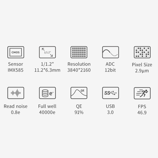●IMX585センサーは Sonyの最新STARVIS™ 2テクノロジーチップです。ゼロアンプグローと低暗電流ノイズを実現して、従来のASI485MCに比べて3倍のフルウェル値を持ち、より高い感度を実現しました。特に850nm以上の波長の赤外領域の感度はASI485MCの1.5倍の高感度になりました。