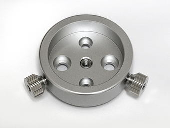 テーパーキャッチャーは、中心に3/8インチ太ネジが切ってあり、そこに通常の1/4インチカメラネジに変換するステンレス製アダプター(太ネジアダプター)がねじ込んであります。必要に応じて使い分けることができます。接続する側にカメラネジがあり、それを逃がしたい場合は、太ネジアダプターを外せばバカ穴として逃がすことができます。このほか、中心の2種類のカメラネジに加えてM6とM8ボルト用のバカ穴が35mm間隔で開けてありますので、他社製の赤道儀やプレートの取り付け穴が適合すれば、お使いいただくことが可能です。